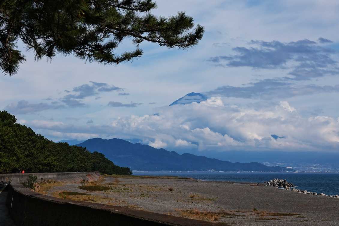 清水駅から三保松原へ向かう。静岡県における景勝地で日本新三景。三保半島の三保松原入口へは、路線バス「しずてつジャストライン」を利用。所要時間は、約30分。1時間に3から4便が運行している。 三保松原(みほのまつばら)は約5kmの海岸に約3万本もの松が生い茂っている。富士見の絶景場所と昔から知られている。松林の緑、打ち寄せる白波そして富士山が見える構図が「絵」になるのだ。歌川広重の富士三十六景「駿河三保松原」や多くの絵画や和歌に詠まれている。訪れた日、雲懸かった富士山を観る。三保松原の一角に、天女伝説として知られている「羽衣の松」がある。半島の中心に向けて、御穂神社(みほじんじや)の参道が続く。この参道は「神の道」と呼ばれ、樹齢300年から400年の松が500mに渡って続く。風の強い日、あるいは照り付ける日差しを和らげてくれる松並木だ。写真1 三保松原と雲を纏う富士。写真2 三保の砂浜と雲富士。写真3 三保の松林と「羽衣の松」。写真4 御穂神社の参道「神の道」を歩く。写真5 御穂神社の鳥居と本堂。写真6 歌川広重の富士三十六景「駿河三保松原」。