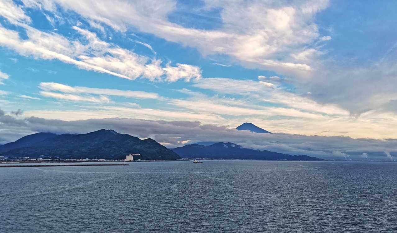 早朝、駿河湾から富士山が見えた。スプリット号の進路は、日の出桟橋のクルーズターミナルに向かわず、コンテナヤードをめざして進む。そして午前7時に興津ふ頭11/12岸壁に接岸した。この場所は、市内中心から離れた場所なので、清水駅へはシャトルバス(所要時間15分-20分)が用意された。 興津ふ頭には、地球深部探査号「ちきゅう」が停泊していた。その前に縦列に並んで接岸する。探査号「ちきゅう」は、海底下7000mまで掘削できるとされる。世界トップクラスの掘削能力を有する探査船。定期的に船内の見学会が開催されている。 駿河湾では秋の味覚、しらす、戻りカツオ,サクラエビなどが獲れる。一方、海底最深部が2500mに達し、日本で最も深い場所とされる。海底南北につながる「駿河トラフ」には、深海魚が生息している。深海魚「リュウグウノツカイ」が生きたまま漂流されることもある。写真1 駿河湾から富士山を観る。写真2 清水港と富士山を眺めて清水港へと。写真3 清水港と富士山。写真4 中腹の雲が消えた瞬間。写真5 三保半島と清水港中心部を見る。写真6 興津ふ頭と地球深部探査号「ちきゅう」。