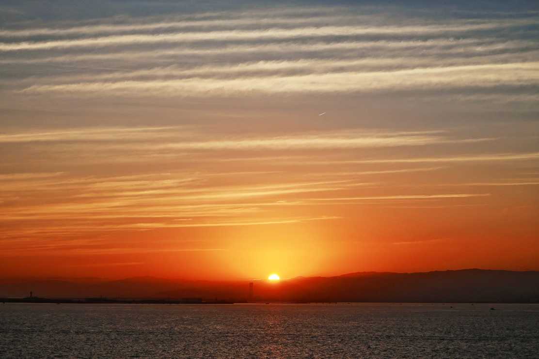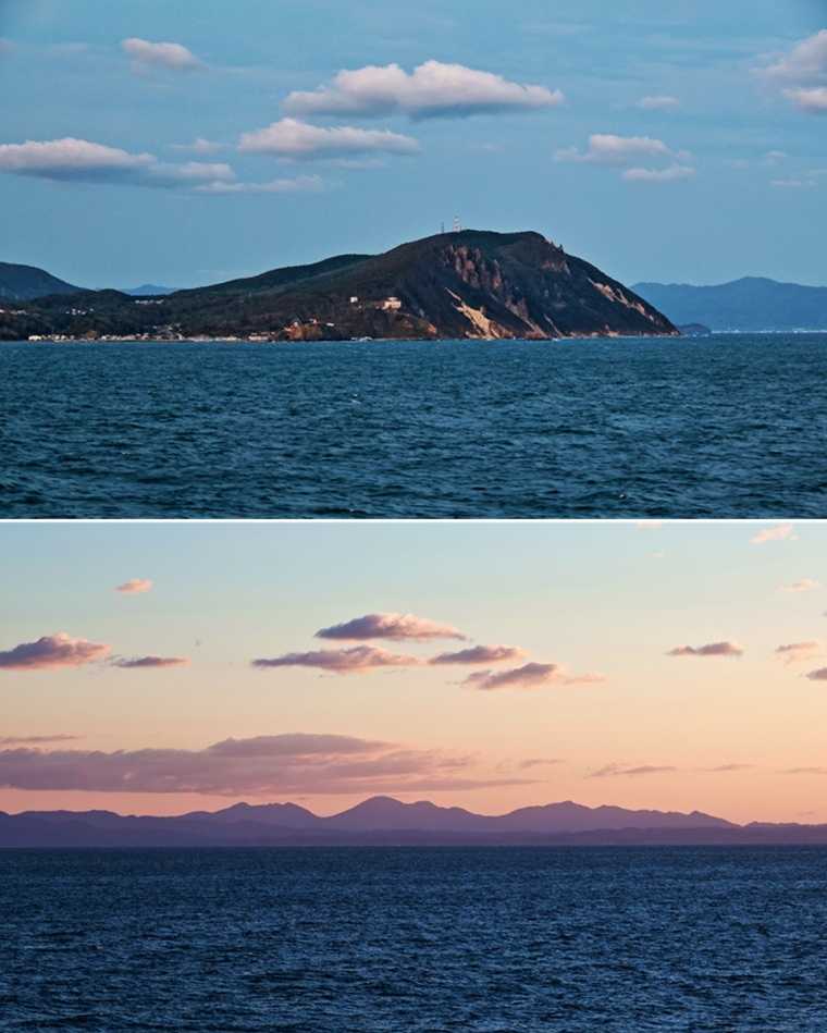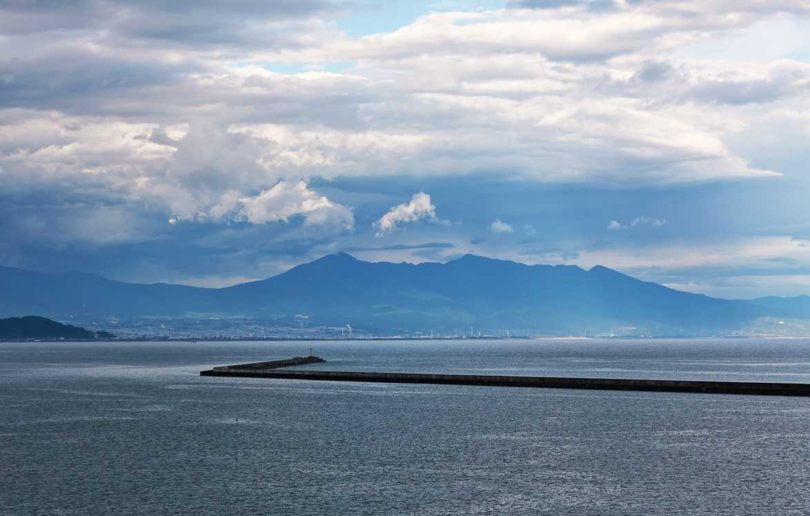 清水港の興津ふ頭を離岸して、早めに神戸港に向かう(2025/10/06、15時)。右舷から三保半島、左舷から外港防波堤とその向こうの「愛鷹連峰」を望む。富士山の南側に、越前岳、呼子岳、愛鷹山(あしたかやま)が連なって見えた。 三保半島を通過する際、小さな白亜の灯台が目に入る。八角形をした「三保灯台(清水灯台とも)」だ。三保灯台は、日本最初の鉄筋コンクリート造りで、明治45年(1912年)に点燈した。灯台の天辺には、天女をデザインした風見鶏が回っている。 日が沈む時刻、客船デッキから駿河湾(太平洋)に沈む夕陽を観る。一方反対側の東の空には満月に近い月が昇っていた。駿河湾海上で、落陽と昇月を同時に眺めることができた。写真1 清水港外港防波堤と愛鷹連峰。写真2 三保半島と三保灯台。写真3 駿河湾の夕景。写真4 水平線に沈んでゆく夕陽。写真5 東から昇る月。写真6 スプリット号の13階デッキ。