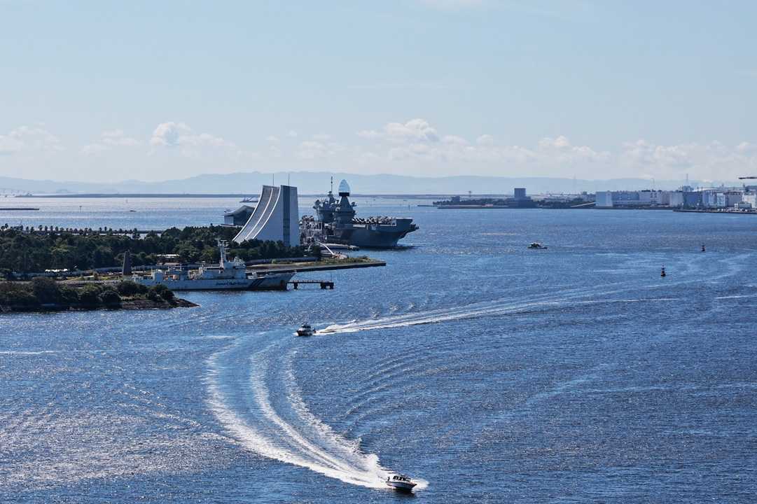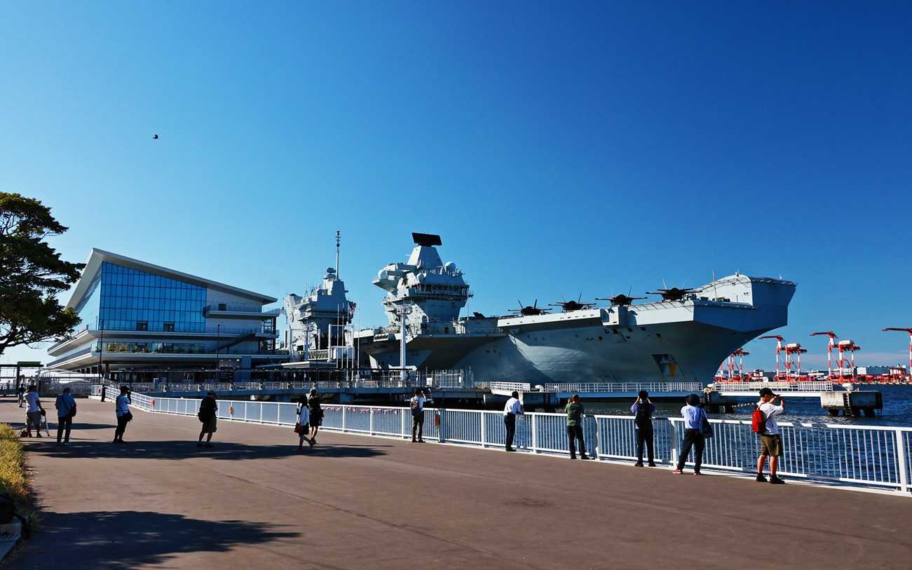英海軍の最新鋭空母プリンス・オブ・ウェールズ(P.O.W)が東京国際クルーズターミナルに、6日間接岸した。8月28日横須賀の米軍基地を午後出航し、夕方碇を降ろした。会議やイベントなどを行い9月2日まで寄港する。この間関係者以外、クルーズターミナル内立ち入り禁止。隣接する潮風公園から空母を眺めた。 プリンス・オブ・ウェールズの一般向け見学会は、8月31日に行われた。抽選で選ばれた90名ほどが空母に乗船できた。倍率450倍の大人気。航空管制を行う艦橋の一部公開、乗組員による作業、そしてF35Bステレス戦闘機を近くで見学できたという。但し、クルーズターミナル施設に軍艦か・・と違和感を抱く人もいた。 プリンス・オブ・ウェールズは、排水量65,000トンで、反り返った甲板と2つの艦橋を有しているのが特徴。午後に出航した。その後他の艦艇とともに南シナ海に入り、84年前に旧日本軍の攻撃により沈没した先代のP.O.Wを追悼するという。海自の「あけぼの」が随行して記念式典を行う予定。写真1 東京に入港した英空母。写真2 東京国際クルーズターミナル。写真3 東京国際クルーズターミナルに接岸した英空母。写真4 艦載機のF35Bステレス戦闘機。写真5 日陰が涼しい潮風公園から眺める。写真6 東京港を進むプリンス・オブ・ウェールズ。