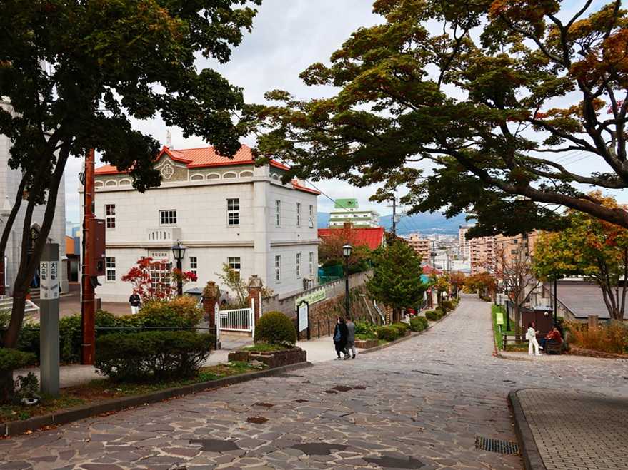 金森赤レンガ倉庫辺りから大三坂(だいさんざか)を上ると、坂の上にカトリック元町教会がある。坂の両側に疑洋風建物と石畳み道が続きエキゾチックな風景となっている。坂名の「大三」坂は、奉行所へ公用でやってくる人のために建てられた郷宿の家印が由来。ナナカマドの街路樹が美しい坂。 函館市内の元町と末広町、その山肌に建物が多く並ぶ。明治に開港された際、政府が用意した外国人居留地は、人気がなかったという。港に出入りする船が見え、日当たりの良い丘と斜面(雑居地)に、外国人の住宅、領事館や教会が建てられた。昭和初期の大火で多くが消失したが、再建されている。 大三坂と八幡坂を上った先に、聖ヨハネ教会とハリストス正教会が建っている。両教会の間を通るように細い道があり、「チャチャ登り」と呼ばれている。これはアイヌ語でおじいさんとの意味で、腰を屈める姿から名付けられた。大三坂と八幡坂は、映画やドラマのロケに登場する。市内を散策する用語として、「はこぶら」が使われていた。写真1 はこぶら 大三坂。写真2 大三坂のカトリック元町教会。写真3 聖ヨハネ教会。写真4 ハリストス正教会。写真5 遺愛幼稚園と旧英国領事館。写真6 八幡坂の石畳みと港風景。