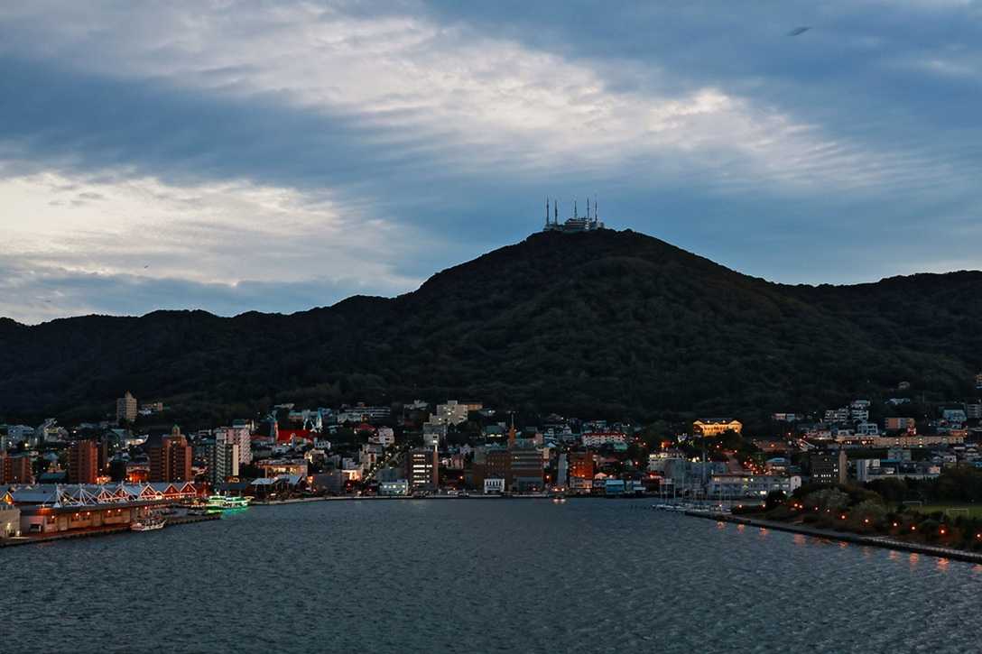 函館港を17時に出航して、次の寄港地・小樽をめざす。日が落ちる夕刻になり、街に灯る。海上から函館の夜景を見る。客船の振動と波の揺れなどで、写真はブレ気味にならざるを得ない。クルーズ船後方デッキから遠ざかる港の灯を見つめる。この日を境に、肌寒くなってゆく。 函館の夜景と言えば、函館山(標高334m)から望む夜景、「日本三大夜景」と云われている。函館港、大森海岸に挟まれた夜街の灯りが扇形に開けるのが特徴。日本夜景遺産にも登録されている。しかし海上から見る夜景は。あまり紹介されていない。湾内を進む船上の夜景をアップします。写真1 函館街の灯り、チラチラ・・。写真2 函館山シルエットと麓の区公会の灯り。写真3 港に夜が訪れる。写真4 緑の島と五稜郭方面の明かり。写真5 ライトアップされた金森倉庫群他写真6 函館ドックと摩周丸記念館。
