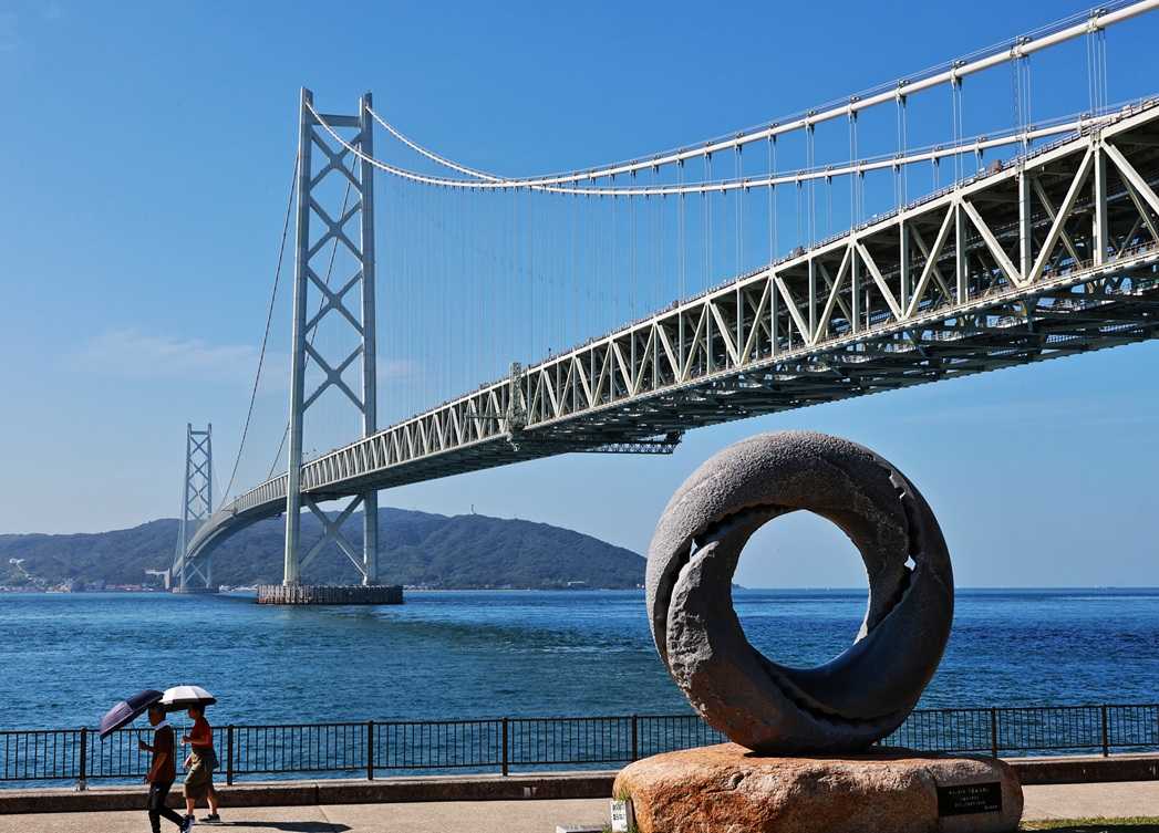 明石海峡大橋をこの目で観るために、JR舞子駅で降りる。三ノ宮駅から快速電車で約20分の距離。昨年、NHKの新プロジェクトX-挑戦者たち「悲願のつり橋に挑む」が取り上げられたこともあり、神戸付近に行った際には、ぜひ立ち寄りたい場所だ。 潮流激しい明石海峡に、世界一の長さとなるつり橋が完成したのは1998年。その際今から70年に、夢を語った人がいて、その思いを受け継いで完成させた国家プロジェクト。困難な工事を通じて、多くの革新技術が生まれた。橋の諸元は、最大支間長さ1991m、主塔の高さ300m。現在トルコのチャナッカレ橋がつり橋では世界一。 「孫文記念館」の傍に、「夢レンズ」というモニュメントがある。「人生すべからく夢なくしてはかないません」との原口氏の言葉が刻まれている。三種の異なった岩脈によるメビウスの輪は、人・自然・科学を、そして本州・淡路・四国を表しているという。素晴らしい「輪」にめぐり合った・・。写真1 明石海峡大橋(神戸側)。写真2 夢の懸け橋と「夢レンズ」。写真3 世界最高峰のつり橋。写真4 巨大アンカレイジとケーブルペンチ。写真5 舞子公園の海辺施設。写真6 公園内にある孫文記念館と旧武藤山治邸。