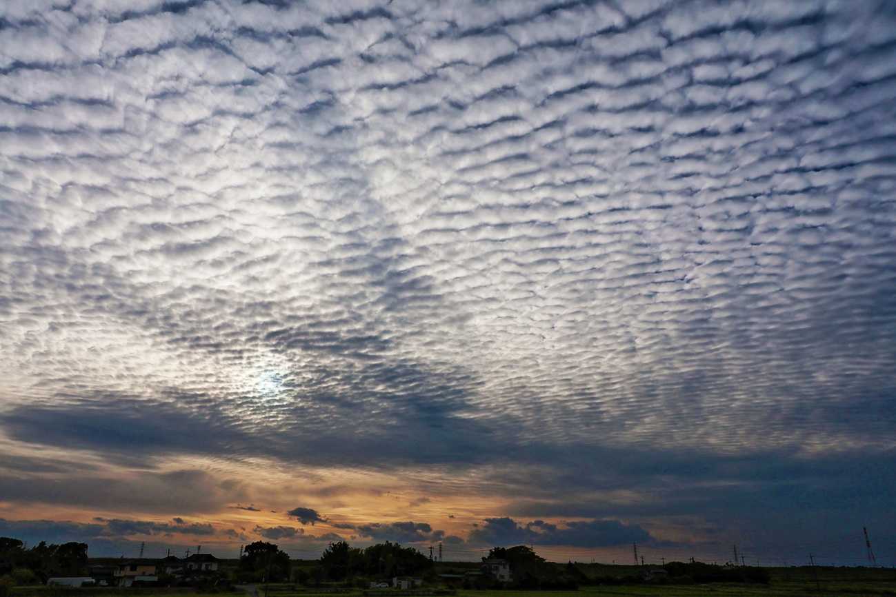 秋の彼岸も過ぎ、ようやく朝晩が涼しくなった。江戸川上空に秋の雲を代表する、「さば雲」が広がった。暑さが和らいだ夕刻近くに、江戸川土手を散歩。風に吹かれて歩く。さてもさば雲を見て、「鯖の味噌煮」を何時食べたかなと考え込む。鯖は高級魚になっている。 秋の風は、大陸育ちの乾いた高気圧が関東まで南下したことによる。軽い空気により、上層雲「巻積雲」が作られたのだろう。鰯雲、鯖雲、鱗雲などは、巻積雲の仲間で、見る人の感じ方よって異なるようだ。今回の雲は、サバの背紋に似ているので鯖雲とした。しかし秋刀魚雲と名付けてもよいかもしれない。写真1 江戸川上空の鯖雲。写真2 サバの大群と鱗雲。写真3 横形と縦形の巻積雲。写真4 物流施設上空のサバ雲。写真5 鯖雲の下を飛行機が・・。写真6 傾く陽と両側の彩雲。