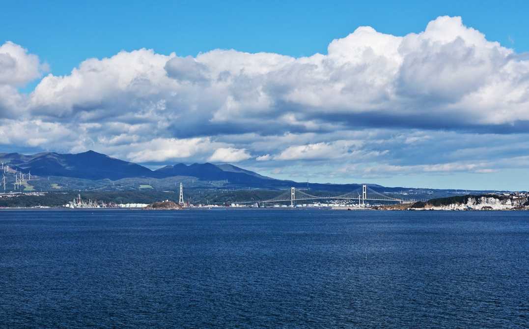 津軽海峡を横断して室蘭へ向かう際、特徴的な岬や埼がある。GPSが発達していなかった時代は、岬や山姿が頼りだった。7時半過ぎ、船は下北半島の東端の尻屋埼(しりやさき)灯台を通過。尻屋埼は、明治9年東北最初の灯台。高さ32.8mの二重レンガ壁造りで土木学会推奨土木遺産であり国の重要文化財。渡島半島南西部(亀田半島)を過ぎると、大きな噴火口をしたような噴火湾(内浦湾が正式)となる。噴火湾越しに、特徴的な山容の駒ヶ岳(標高1131m)と砂原岳(標高1112m)を眺めることができる。しばらくすると、洞爺湖の奥に蝦夷富士と呼ばれる羊蹄山(標高1898m)が見えた。 船は、噴火湾の東縁に沿って、室蘭港をめざす。途中、室蘭を代表する地峡岬と測量山を船右舷から望む。測量山は、標高199.6mと高くないが、見晴らし良いピーク。測量山の由来は、明治5年札幌へ至る道路(現在の国道36号)建設のため開拓使の米国人技術者が測量するのに登ったことから・・。写真1 北海道の陸地が見えた。写真2 下北半島東端の尻屋埼灯台。写真3 渡島半島と恵山と岬灯台。写真4 噴火湾越しの北海道駒ヶ岳。写真5 室蘭の測量山と地球岬。写真6 噴火湾と蝦夷富士(羊蹄山)。写真7 噴火湾の大きさと形状。