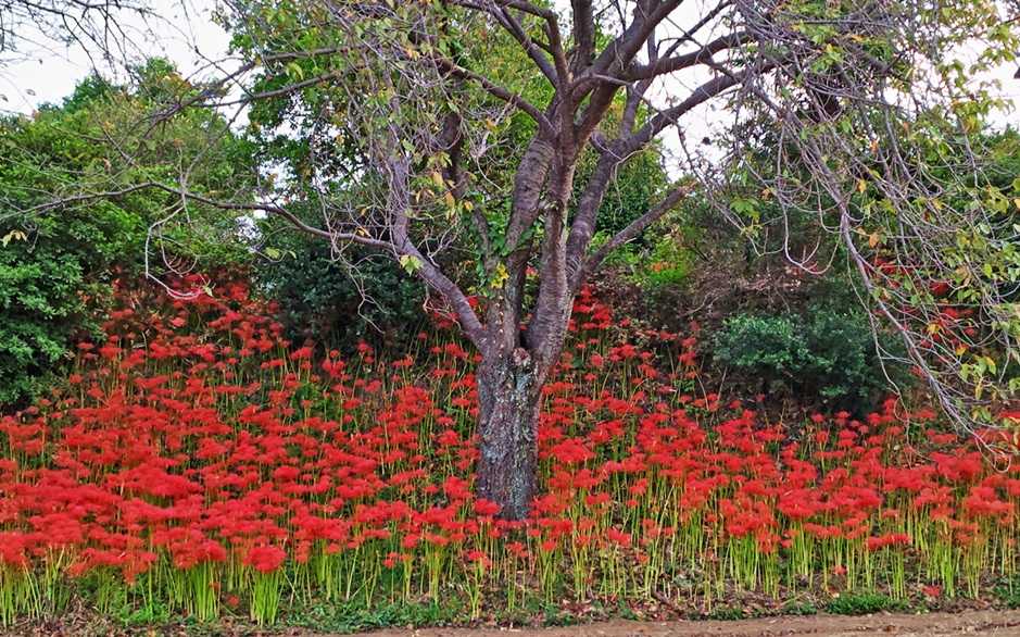 朝散歩の途中も近隣住民の畑の端に、桜が立っている。背後が斜面となっているが、桜樹を囲むように「曼殊沙華」が咲いていた。春は八重桜が畑を彩る。秋は曼殊沙華を見ることができる。 曼殊沙華と彼岸花は同じ花であるが、聞いた印象が異なる。相反する2面性を持つ花といえる。彼岸花と言えば、江戸時代から妖艶ではあるが、不吉と結界の印と考える人が多かったようだ。曼殊沙華は、サンスリット語から美しい吉祥なる花で、天上の出来事を祝す時に降りるとされる。写真1 桜樹の下の曼殊沙華。写真2 白一点的な曼殊沙華。写真3 桜樹を囲む。妖艶な花。写真4 道路から下方を見る。写真5 吉祥なる花。写真6 天上から降りてきた曼殊沙華。
