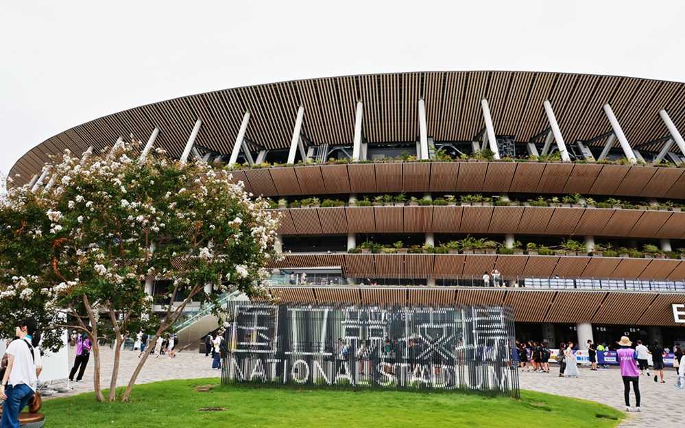 東京オリンピック2020に間に合わせるために、当時急速工事を強いられた国立競技場。36ケ月の工事期間で2019年12月に完成した。しかしコロナで大会そのものが1年遅れた。設計コンペで、隈研吾氏案の木材を大量に使用した「杜のスタジアム」が採用された。観客規模は68,000席(そのうち車いす500席)。 スタジアムの最大の特徴は、47都道府県の木材を集めて、大型の軒庇(のきひさし)を4層にわたり建築したデザインだろうか。更に、大屋根は鉄骨と木材を組み合わせたハイブリッド構造。そして全周にわたり屋根をスタンド背面で支える片持ち梁となっている。スタンド内からは、視界を遮る柱がないのも特徴。」 国立競技場は、観客とアスリートとが一体となるように造られている。観客の席がモザイク状になっているのは、大屋根からの木漏れ日をイメージ。5色のアースカラーが使用されている。外観の高さが50mと低く、明治神宮外苑の景観に配慮されている。高校サッカーの聖地でもある「国立」。若いアスリートが羽ばたいて行く聖地になれば・・。写真1 国立競技場外苑門から。写真2 大型四層の軒庇(のきひさし)。写真3 スタジアムの空とモザイク状の観客席。写真4 大屋根の構造。写真5 スタジアム内部の様子。写真6 各層に植栽が施されている。2階平面図。