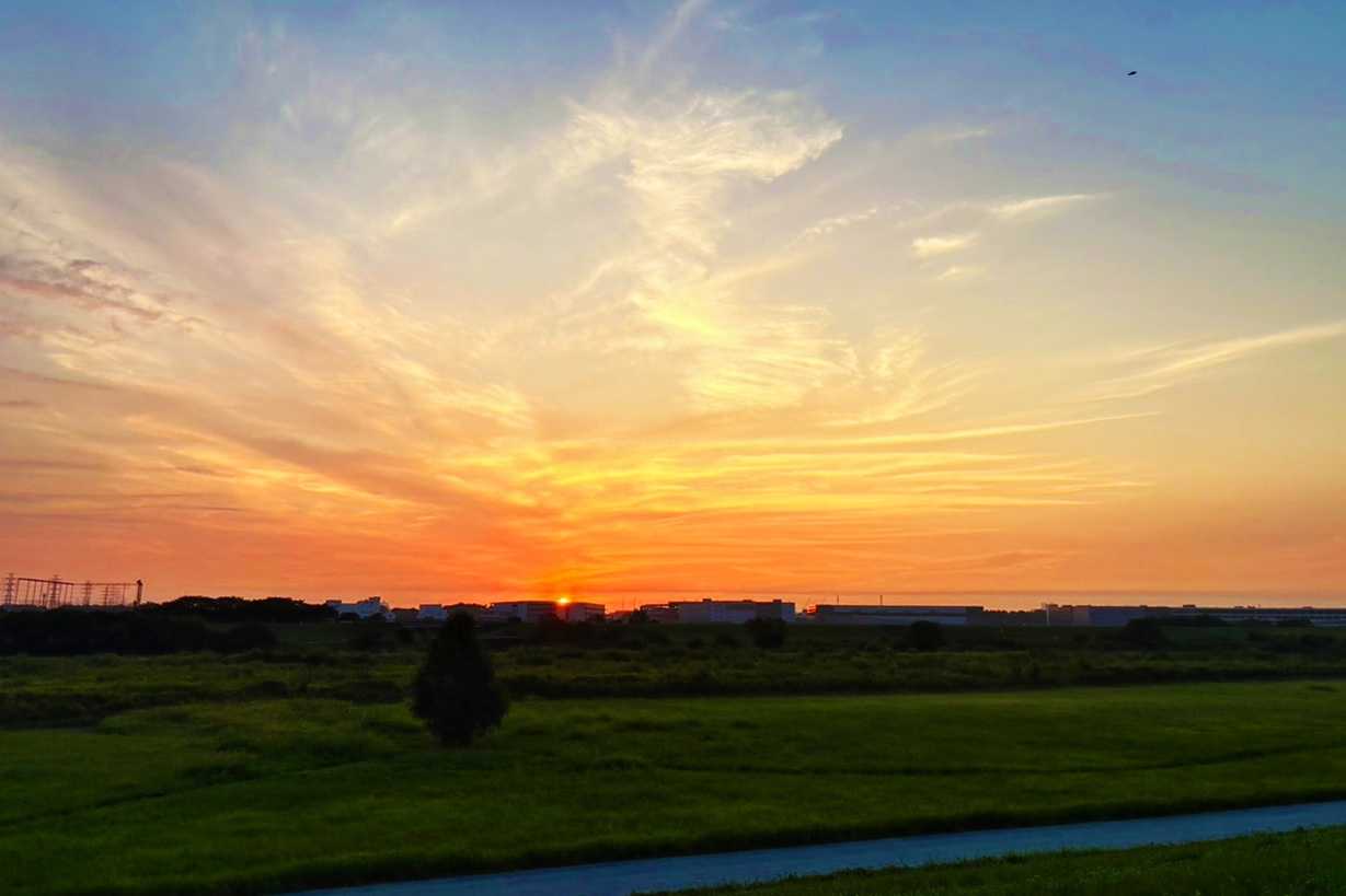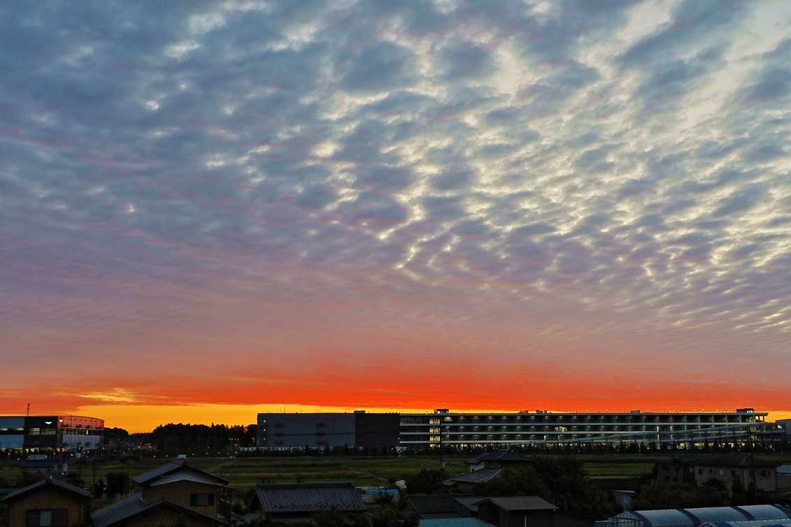 早朝、東の空が赤く染まった。上空に薄い雲と鱗雲または鰯雲が広がり、それらの雲群が赤く燃えていた。一般に朝焼けは、天気が崩れる兆候とされる。低気圧や前線が西から近づいてくることが多い。空気の水蒸気が多いなか、太陽の光が低い角度で通過して赤色の光が強く見えるとされる。 自然現象の朝焼けは、徐々に赤くなり、そして雲色または空色に戻ってゆく。匂いはなく、鳥の鳴き声が聞こえる場合があるので静寂だ。一方、ウクライナやガザ地区では、ミサイルの爆発や建物火災で空を赤く焦がしている。この場合は、騒音と臭いの喧騒の世界になるこの世は、人為的な朝焼けを無くすることができないでいる。写真1 赤く染まり始めた朝焼け。写真2 物流施設上空の朝焼け。写真3 上層のウロコ雲も焼ける。写真4 壮大な朝焼けの空。写真5 土手道路と筑波山。写真6 江戸川の水面と空。