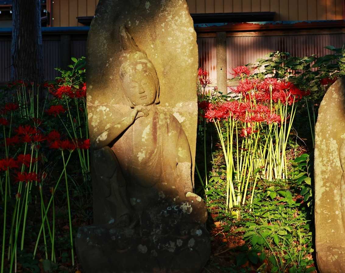 秋彼岸が終るころ、暑い真夏がようやく過ぎゆく。すると涼しくなるのを待ちわびたように、曼殊沙華が彼方此方(あっちこっち)で咲き始めた。そう言えば昨年もこの道端で赤い彼岸花を見たなあと思い出す。朝散歩をルート変更して、お寺や小さな神社に咲く赤花を観る。 今年の墓参りは、曇りの日を選んで墓掃除と花を供えてきた。牛久聖地公苑行く途中、地元農産物の直売所に寄って、新米を買う。ミルキークイーン玄米30キロは、昨年より5割アップの2万1千円。5キロ換算で3500円。ブレンド米より少し安価。新米なので例年以上に良く噛みしめて食べようと思う。 今年の彼岸花は、猛暑の影響もあり遅れた開花した。「彼岸過花」となった。この花は真夏の地熱がある時期を休眠する。そして朝晩が20度程度に気温が下がると、開花のスイッチが入るとされる。暑さ寒さも彼岸まで、との自然の営みにも合致する花だ・・。写真1 スポット日差しを浴びる石仏と彼岸花。写真2 淨観寺の石仏。写真3 淨観寺境内の彼岸花。写真4 陽を浴びる赤花。写真5 地元の香取神社。写真6 参道口の彼岸花。
