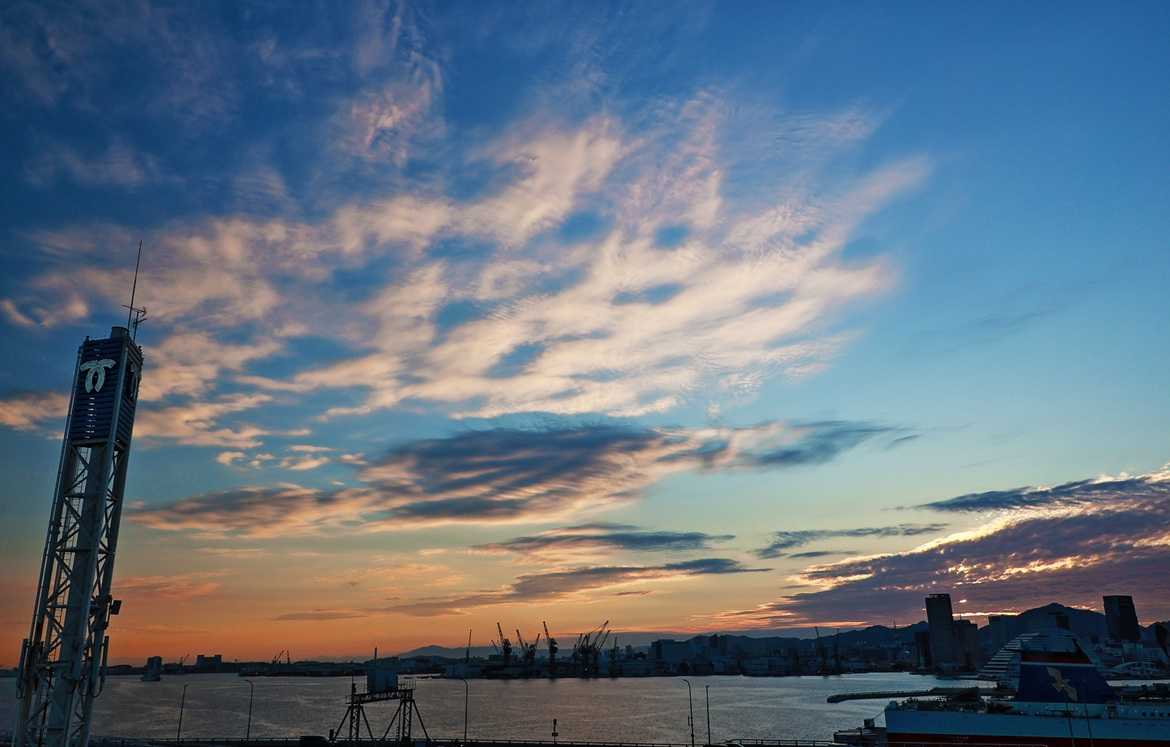 神戸入港には午前8時半に接岸する。神戸ポートターミナルの利用は、今回で3回目となる。同ターミナルは、新神戸交通の高架鉄道(無人無運転)駅に直結しているので、非常に便利だ。JR三宮駅まで6分もあれば着く。大阪・京都、そして姫路まで足を伸すことが容易なターミナル波止場。 神戸ポートターミナルは、2015年耐震化を含めた改修工事がなされた機能的にリニューアルされた。特徴のひとつに、長さ46m×高さ16.7mの搭乗橋(国内最大規模)が設備された。これにより乗客が岸壁に降りることなく、3階建のターミナルビルに入ることができる。出入国管理と税関は、2階にある。 神戸港における大型客船の航路は、フェリー船などと異なり、ポートランド東側から入港し、摩耶ふ頭の南沖を進んで着岸する。沢山のコンテナ資材を観ながら・・。神戸港のコンテナ取扱量は、東京港についで、横浜港と並みだという、因みに東京港は、上海の30分の1で、世界第46位の取扱量とか・・。斜陽化する日本海運業がある。写真1 大阪湾の夜明け。写真2 日の出と残月。写真3 神戸港を望む。写真4 六甲山地と摩耶ふ頭。写真5 神戸大橋と神戸ウオーターフロント。写真6 ポートターミナルと付属の搭乗橋。