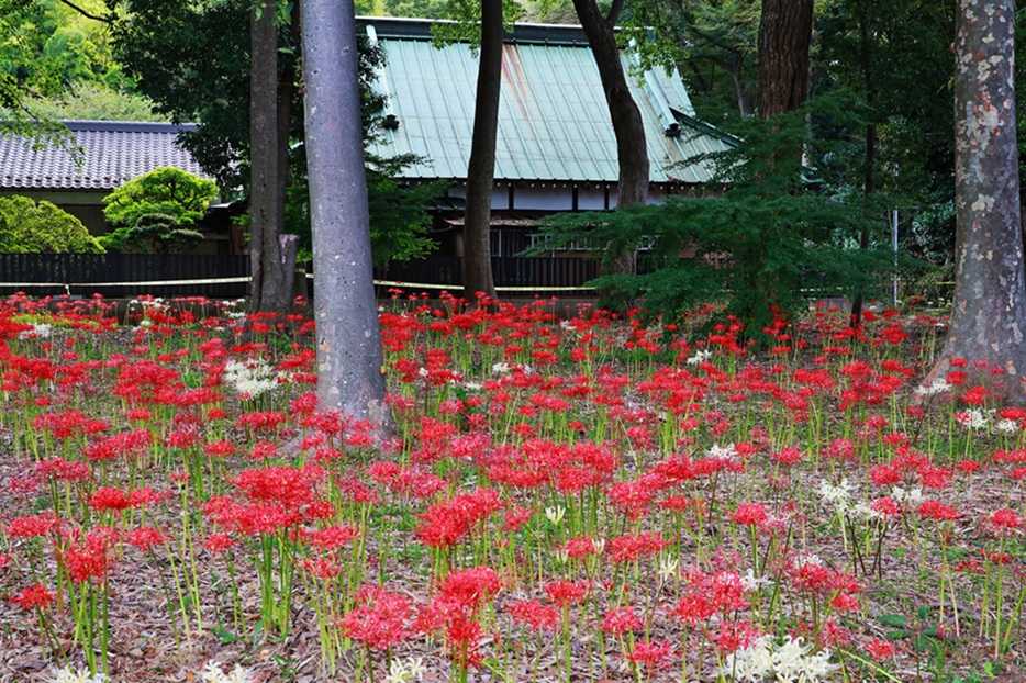 千葉県における彼岸花の名所のひとつ、松戸の祖光院(そこういん)を訪れた。毎年秋彼岸の頃、境内の雑木林に約2万本の彼岸花が咲き広がる。赤色と白色そして黄色の冠状の花が咲きほこる。夏の猛暑のため、開花が少し遅れた。かつ花数も減少したようだ。 祖光院の創建は、文政8年(1825年)頃とされる。約200年前、金ケ作(かねがさく)開墾のために、川越から入植した人々が、川越・養寿院の住職を迎えて、「金成山」を開山する。鶴見總持寺のながれをくむ曹洞宗の寺院。如意輪観音を本尊としている。 松戸七福神の恵比寿と大黒天の石像が置かれている。京成線・常盤台駅から徒歩10分ほどの距離にあるので、朝散歩の延長線で訪れることができる。昼間は、大勢の花見客で狭い参道に人が溢れる。写真1 千葉県における彼岸花の名所祖光院。写真2 彼岸花の開花様子の比較(本堂前)。写真3 祖光院境内の彼岸花。写真4 彼岸花を近くで観る。写真5 竹林の曼殊沙華と如意輪観音。写真6 七福神の恵比寿と大黒天の石像。