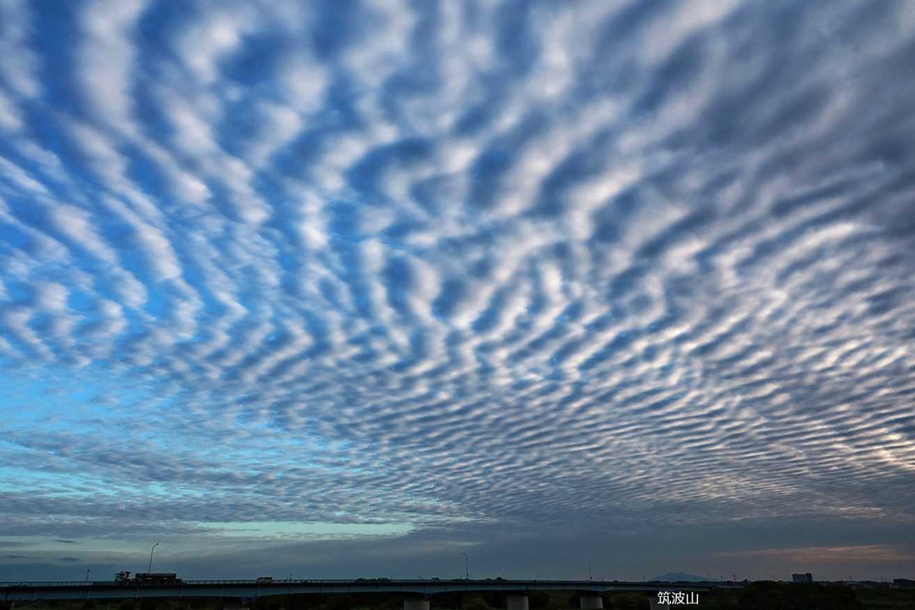 江戸川沿いを散歩中に空を見上げると秋を象徴する雲が広がっていた。筑波山の方向(北東)から鰯の大群が押し寄せて来るような光景だ。江戸川上空では、大きく成長して踊るような魚形になる。いわし雲とさば雲等が複合した秋雲が江戸川を一時覆った。 秋の空は、空に浮かぶ芸術作品ともいわれる。特に朝夕の太陽光が印象的な雲景色を創る。すじ雲、はね雲、うろこ雲、いわし雲、さば雲など多くの俗称がある秋雲。ほとんど上空5000mから10000mに現れる巻積雲(けんせきうん)とされる。これらの雲が見られる期間は短い。秋雨前線が消えると、冬が足早にやってくる。写真1 筑波山方面から湧き出す鰯と鯖の大群。写真2 江戸川の上流と下流の空模様。写真3 鱗雲が主体の空。写真4 玉葉橋の上空。写真5 都心の方向にも魚雲が並んでいた。写真6 江戸川の水面と雲。