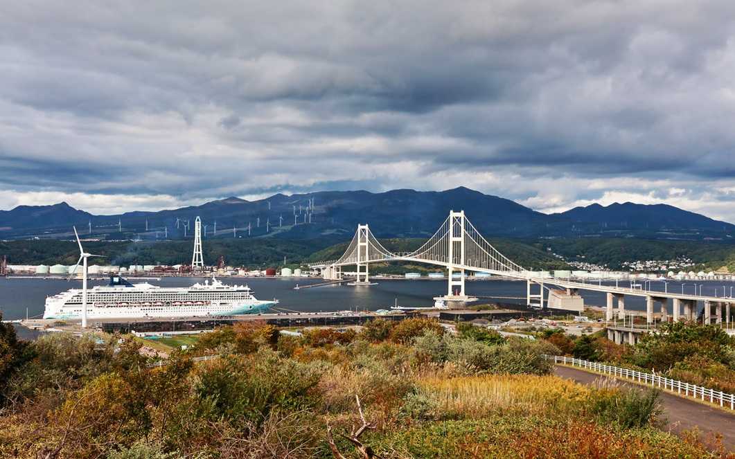 台風を避けるように航路変更して、室蘭港・祝津ふ頭に着いたのは13時頃。滞在時間7時間を確保すべく出航は20時。急の大型船入港のため、室蘭の港湾関係者には迷惑をかけたが、スムーズな接岸となった。一方、シャトルバスや観光バスは手配がつかず、移動手段はタクシー。市内のタクシーでは数が足りていないようだ。 白鳥大橋のたもとに当たる祝津ふ頭は、数年前に大型船が接岸できるように整備された。岸壁長410m×水深11mに改良して、22万トン級の超大型船まで対応できるという。駐車スペースは十分あるので、雨風をしのぐターミナル施設が欲しいところだ。バスを利用すると、登別温泉や洞爺湖などの日帰り観光も可能だ。 祝津ふ頭のすぐ近く(西に1.2km)に、小さな島。大黒島が浮かぶ。島頂部に白い建物が立っている。「旧室蘭灯台の廃墟」で、心霊スポットにもなっているとか。1796年英国船プロビデンス号が来航した際、水兵のハンス・オルソンが事故死して埋葬されたという。「オルソン島」とも呼ばれ、黒百合が咲きだしてと逸話もある。写真1 室蘭港を望む。写真2 室蘭港のシンボル、白鳥大橋。写真3 祝津ふ頭近くの大黒島(オルソン島)。写真4 港内の風景。写真5 スプリット号が祝津ふ頭に接岸。写真6 祝津臨海公園のモニュメントなど。