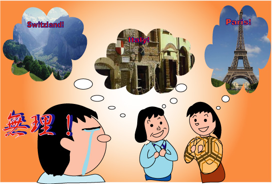 パリ! 華の都パリはまず行きたいねぇ!。それから スイス! アルプスの山々も見てみたいねぇ!。あ、あとそれから ローマ! ローマの休日 の舞台は見ておかなきゃさぁ!それから、 カサブランカ あの映画はよかったんだよ~・・・。それからえっとねぇ・・。」