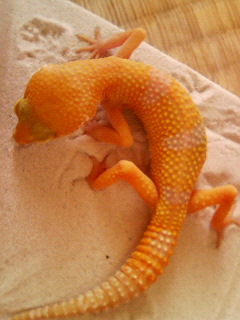 本日二本目の日記(笑)二日に1回寝てる感じの忙しい日々の中新たに新しい家族が増えました(●´ω`●)ゞエヘヘ小さくて・・・それはそれは可愛い仔デスこんな感じで到着最初ダンボ-ルを開けて、生体の入っている箱を見るとそこには誰の姿もなく・・・顔を青ざめながら慎重に捜していたら・・・キッチンペ-パ-の下にかくれんぼしてました(゜×゜*)プッさぁ・・・誰だか分かりますか(^ー^* )フフ♪ニシアフリカトカゲモドキですもうメサメサ小さくて・・・可愛いんだけど・・・チョット怖い(;´▽`A``餌をあげようとすると 『ぎゃぁ~』 っと鳴きますw四枚目の写真のように尻尾が寸詰まりちゃん("▽"*)カワイイクシュっとボテッと(笑)これがまた(★//∀//)..o○(めっちゃカワイイ)この尻尾に惚れました一目見た瞬間に色柄などから名前は即決まりました『どんぐり』です((●>艸<))ププ2008年4月28日生アルビノヘテロ今の所の新居はプラケの小シェルタ-Sこれでも広々デス(どんだけチビチビなの~)先週の金曜日『2008年6月21日』に到着してからずっとシェッルタ-の中サミシイ…餌はちゃんと食べて、ウンチョもしています私が見ていない時に 『コソッッ』 っと出てきて『プリプリ』 としているんでしょう(* >ω<)=3ブブッッまだまだベビ-だし、新居に慣れるまでそぉ~っとしておきます(*●´З`●)テレテレ たくさん食べてムチムチと元気いっぱい大きくなってねそして、長い時間を一緒に過ごそうねどんぐり共々これからもヨロシクお願い致しますチュッ(●´з`)っ⌒☆どんぐりの元親様&SHOP様はモチロンかずみお姉ちゃんの所デスいつも本当に有難う御座いますヽ('∀`*)ノ感謝