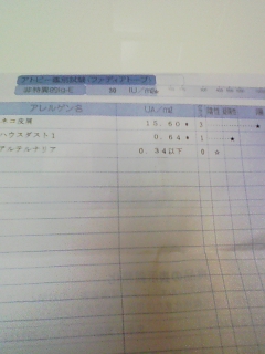 茶碗蒸しに入ってる栗が大好きゆかたんです。アレってやたらと食べたくなる時があるんだよなぁ・・・・そんな事は置いといて、タイトルの“告白”一体何を告白するのかと言えば、現在私は猫のモモちゃんをかってますが・・・・・・・・ ・・・・・・・・ ・・・・・・・・ アタクシ、猫アレルギーでしたこれには流石に参りましたねぇ。モモが家に来た日、『おやおや?鼻水が・・・・・』そして翌日、『アレレ?目がかゆいなぁ・・・・・ってかマブタ腫れてないか?!』そして翌々日深夜、『咳が止まらない!!ヒューヒューする!!』勿論、アタクシは喘息持ちではありません。流石にこういった症状が出ると、何をしていても辛いっっ翌日病院へ行きました。念のため血液検査をして頂き、薬を処方してもらいました。ちなみに血液検査では、猫・ハウスダストの検査を依頼しました。そして本日、検査結果を聞いてまいりました。写真がぶれてて見づらいですが、見事なまでに猫アレルギーでしたお医者さんには、『完全に猫アレルギーですね。』と言われ、更に、『鼻水と目のかゆみで治まってればまだ大丈夫ですが、 喘息が出ると命の危険もありますよ。』と言われてしまいました。だからと言って、私はモモを誰かに譲る気が全くないので当然アレルギーは薬で抑えつつ、寝室は別々に、掃除は今まで通り、掃除機&○イックルワイパーで拭き掃除を毎日、空気清浄機をこれから購入・・・・・と考えてます。彼は、彼の実家に譲ろうと言ってましたが、『そんなのありえない』と一蹴しました。今まで、猫ちゃんを飼っている友達の家に泊っても(私の周りには何故か猫を飼ってる子が多い)、こんな事無かったのに・・・・色々調べてみたら、抵抗力が弱ってる時にアレルギーになりやすいみたいですね。私はアレルギーと戦わねばっとかなり闘志を燃やしておりますよ。以上で告白終了ですそんな私をよそに、モモは今日も元気です先日、かわいい一人娘の為にキャットタワーを購入致しました買う予定は全く無かったんですが、半額だったのでついつい寝てるねぇどうやら気に入った様で、ココで毎日寝てますそうそう。この写真では首輪してますが、昨日モモは首輪をちぎりました全くやんちゃな娘ですまた、かわいい首輪探ししなきゃ