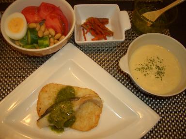 今日は夕方遅く帰ってから、ばたばたと夕食を作りました。でも今日の夕ごはんは手早く作ったわりには美味しかった~(自画自賛?)メニューはたらのムニエルとハッシュドポテトのジェノベーゼソース添え、大豆のサラダ、豆乳クリームコーンスープ、ちくわとにんじんのきんぴら風(朝のお弁当の残り)です。メインのメニューは作りながら考えたもの。たらが小さかったのでボリュームを出すため冷凍のハッシュドポテドを添えたら好評でした。たらの味付けはクレイジーソルトです。豆乳クリームスープは最近買った小林まさみさんの料理本「うちに帰ってから15分で作れる晩ごはん」より選びました。あっさりしていてヘルシーな味です。暑い時はあっさり味のスープのほうが私は好みなんですが、主人は濃厚なスープが好きなようです。最近スピーディーに料理を作らないといけない日が多いのでいろいろ工夫しなくちゃと思っています。まだ買ったばかりでまだ評価はできませんが表紙の写真や中のお料理の写真が気に入ってます。うちに帰ってから15分で作れる晩ごはん