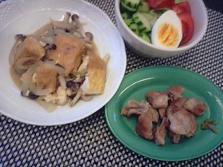 毎日蒸し暑くて食欲も落ちています。そんな時はめんつゆ等を使ってさっぱりとした味付けにします。自分が食欲ないから品数も少なめで、、、。メニューは鶏のはらみ焼き、厚揚げとしめじとたまねぎの炒め物、サラダです。はらみ焼きは柚子コショーをつけていただきました。それだけでも食欲アップ!そして厚揚げの炒め物は塩・コショーとめんつゆで味付けしました。めんつゆで炒めるとさっぱりした味に仕上がりますね。ただ今、娘からの連絡を待っているところです。一日中お友達と遊んでいるはずだから連絡し忘れるかなあ(~_~;)