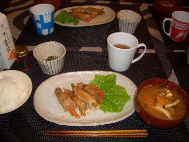 最近夕方まで出かけることが多いのでスピーディーにできる炒め物が多くなっています。ヘルシーな米油やオリーヴオイルを使っているといっても、油には変わりありませんからもう少し料理法を考えなくては。日曜日。久々に豚肉の野菜巻き。メニューは豚肉の野菜巻きサンチェ添え、小松菜とちりめんじゃこと黒ごまのだし醤油がけ、かぼちゃとにんじんとえのきと薄揚げの味噌汁です。品数が少ない分、中に入れる具を多くしたつもりです。豚肉の野菜巻きはにんじんといんげん、長ネギと種類を巻き、だし醤油、みりん、酒で煮からめ、七味をかけていただきました。小松菜はおひたしにするよりもあっさりとだし醤油で食べるほうが好きです。味のアクセントにちりめんじゃこをゴマ油で炒め、摺った黒ゴマをかけています。月曜日。朝のお弁当のおかずも利用してスピーディーに。メニューは鶏ささみのピカタ、ひろうすとちくわと大根とにんじんといんげんの煮物、ミネストローネスープ、レタスサラダです。煮物はひろうす以外は朝お弁当用にだしから作りました。多めのだしにして夜はひろうすをたして煮込みました。火曜日。かなり手早く手を動かして作りました。メニューは鮭のクレイジーソルト味のソテー、鶏のトマト煮、カリフラワーと玉子とハムのマヨネーズ合え、干し海老のっけの冷奴です。鶏のトマト煮は前日のミネストローネと味が似通ってしまいました(>__