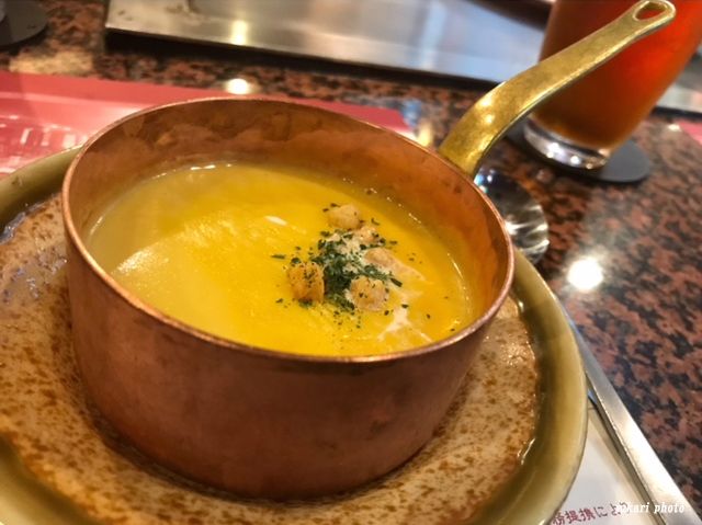 まずは、サラダバーを取っている間にポタージュスープを温めてくれています。