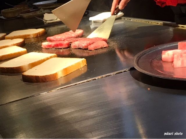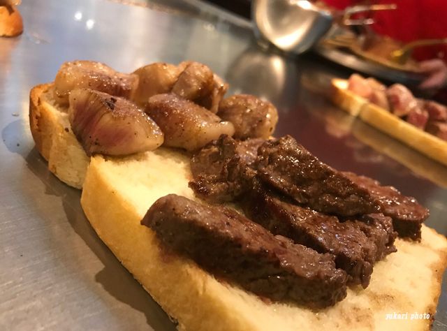 目の前の鉄板でお肉やお野菜など焼いてくれるお店です。