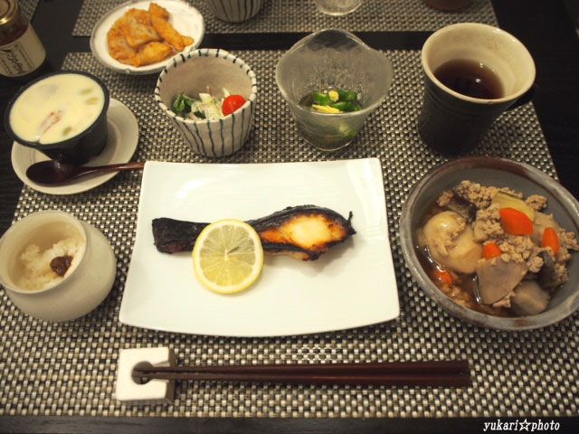 銀ひらすの味噌漬け、☆鶏ひき肉と野菜の煮物(里芋、人参、なす、土生姜)、茶わん蒸し(生協品)、☆きゅうりとハムのマヨサラダ(黒ゴマ、レモン、トマト)、もずく酢(おくら、針生姜)、練り天(玉ねぎ、蓮根)