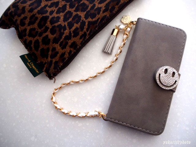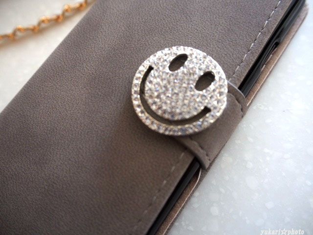 今度はグレージュのような色のケースにスマイルがワンポイントのスマホケースです。