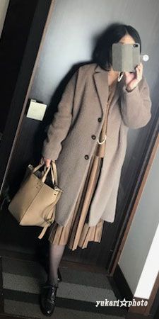 コートを脱ぐとトップスとボトムスがほぼ同じ色合い。
