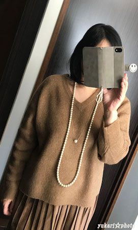 ネックレスはコットンパールと一粒パールを重ね付けしました。