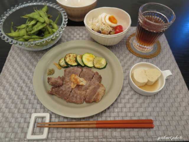 ☆豚のステーキ(豚肩ロース、にんにく、柚子胡椒)、☆ズッキーニのチーズ焼き、湯葉豆腐、サラダ(きゃべつ、ミックスビーンズ、トマト、ゆで玉子)、枝豆