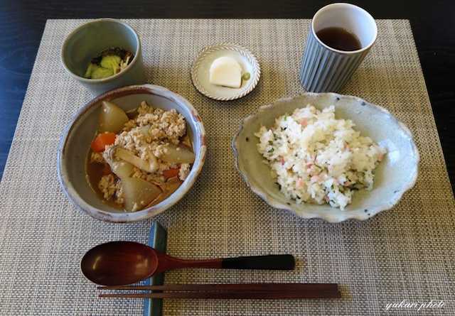 ☆煮物(鶏ひき肉、大根、人参、しめじ)、刺身かまぼこ、もずく酢(きゅうり、梅干し、針生姜)、☆ニンニクチャーハン(にんにく、ベーコン、青じそ)