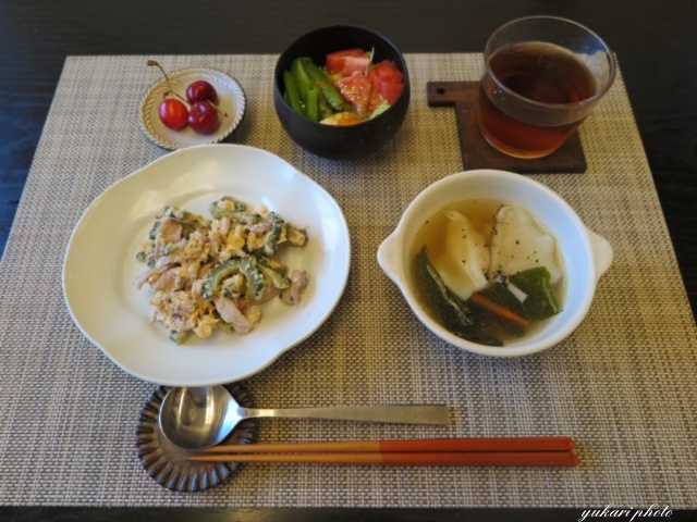 ☆ゴーヤチャンプル(豚肉、ゴーヤ、豆腐、玉子、おかか)、サラダ(レタス、スナップエンドウ、トマト、ゆで玉子、キヌア)、☆水餃子のスープ(水餃子、人参、エリンギ、わかめ、黒ごま)、さくらんぼ