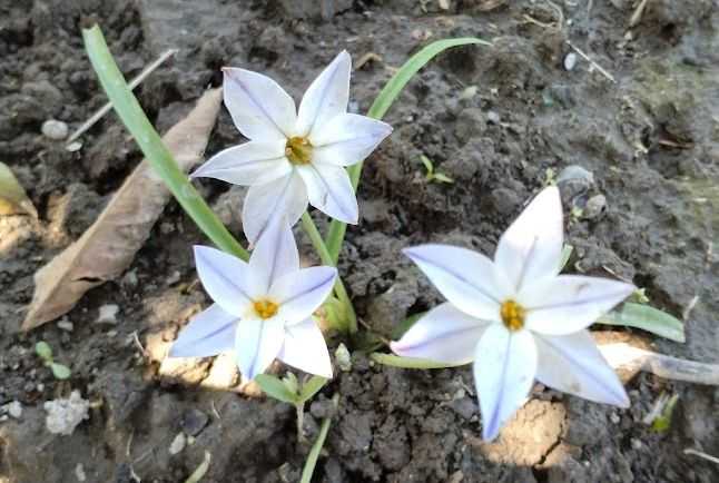 畑の柿の木の下で咲く花ニラ、夫に削り取られていたのに