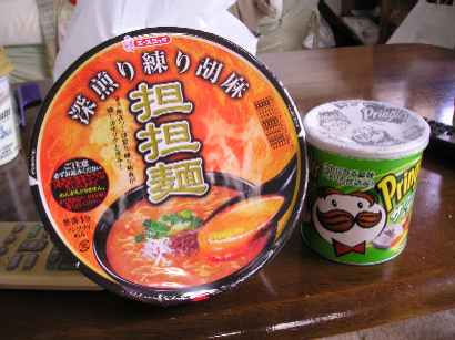 今日は、ダーリンが1泊2日で宮崎に出かけました。専門学校時代の友達が結婚するとのことで、長崎から5人で車に乗ってお出掛けだそうです。本日の午後に式が始まるそうで、出発時間は夜中の3時半すぎ。今回はダーリンだけのお出掛けですから、ね。。。。はい。。。。ちゃんと眠い目を擦って、待ち合わせ場所まで車で送らせていただきました。で、戻ってきてから、再び睡眠。午前中におきてから、チビ2匹を獣医さんにみて貰い帰ってくるときにふと気づきました。。。。「そうだ!今日は夕飯作らなくていいんだ」日頃は、お昼ご飯を食べながら、毎日の夕飯の献立を考えているのですが、今日は、ワタシ一人!!猫様の食事はいつも決まっているから、考えなくていいんだ!!え~どうしましょう。結婚してから、ダーリンがいない夜なんて初めて♪え~贅沢してもばれないんですよ。どうしましょう。。。なぁんて、ウカレながらコンビニへGO!お昼ゴハンは悩んだ末に↓になりました。贅沢したいなんていいながら、結局この程度に終るのですが、それでも十分満足。さぁて、夜はなんにしようかな。