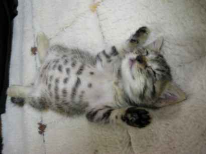 我が家に仔猫さんがいらっしゃってから、お坊ちゃまの落ち着きの無さが目立っておりましたが、ようやくそれらが「猫」であることを認識した様子。最近では、仔猫に「兄さん」と慕われ、カルガモの親子ばりに行列を作って遊んでおります。しかし、この「兄さん」は仔猫が邪魔をしない数少ないポジションで独り黄昏ることが多くなってまいりました。ね、渋すぎる!!渡 哲也ばりでしょうそんな「兄さん」を尻目に仔猫さんたちは無邪気に遊んでおります。下のほうに写っている脚はもちろんごま油のです。今日もこんな感じでじゃれています。