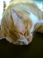 最近、ボンの背中に黒い汚れが目立つように。。。ついでにフケもひどかった。毎日とは言わないまでもブラッシングしてるのに。。。で、久しぶりの洗濯と相成りました。ごま油はジャージに着替え戦闘態勢で、ボンをだっこし、脱衣所まで行くとまず脱衣所のドアをがっちり閉める。すると、ボンさん逃げ道がなくなり、ようやく自分がやばいことになっていることに気づく。ここからが格闘。風呂場のドアを開け、ボンを中へ誘導。すぐさま風呂場のドアを閉める。ここでごま油ミスしました。タオルをバスタブに置いておかなかった。最初は、必死でごま油に登り逃げていたボンさんも、とうとう観念したのか、シャワーの時は落ち着いて(いや、固まって)シャンプーしてくれました。その後、風呂場のドアを開け、脱衣所でドライタオル。ここまでは、近年稀に見る順調ぶり。あとは脱衣所のドアの前に固まっているボンさんをドライヤーにかけてしまうことのみ!ぶぉ~っと音を立てるドライヤーに猫ちゃんパンチが炸裂!しかし、これも一度だけであとはすんなり、いや諦めてくれたようで半乾きになった状態で外へ出してあげました。すると、滑りながら廊下をよたよた。腰が抜けてたんですね。あとは部屋の中でドライタオルをして、ブラッシングして完了。久しぶりで疲れたね。ボンさん。