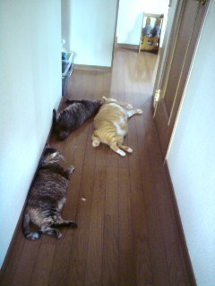 我が家の夏の恒例。ネコ爆弾。廊下にびっしりとネコ地雷が埋まってます。トイレの前に居座るので、トイレの度ごとに横へずらして入る始末。早く夏よ終われ。