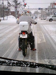 今朝出勤の時大急ぎで車庫からDJ1を出していたら.....妻が出てきていきなりババラッチ...あっいや..パパラッチされた~けわしい顔でDJ1を車庫からバックで出すの図(ナニしてんの?)切り返して右方向へスタートするの図(ツルツルで今日は滑るな~)着ぶくれ短足でカッコ悪っ!