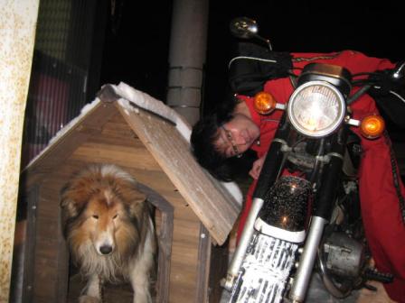 おい!見てくれ~ワンコ!!フロントもチェーンにしたぞー!!昨日までリアのみチェーンでフロントはスパイクタイヤを履いていたけど.....どうも相性が良くないな~~~~つうんでぇ~フロントもノーマルタイヤに戻しチェーンにしたべさぁ~~んでぇ~なじみのモトさんのとこでフロントのタイヤ交換とチェーン装着をシコシコしてたら~~~御老体のフロントブレーキワイヤーが逝った~んなぁ~わけありありでぇ~モトさんからの帰りは~フロントブレーキなっしんぐぅ~~♪にわかアメリカン野郎だぜぃ!でぇ~当然最後は~~~雪も降ってきたので~お約束の半袖~~~♪撮影は~自称「雪国のパー子」の雪国妻でした~~~