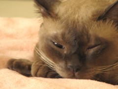 子猫の時から目が弱点です。最近は調子良かったのですが、2週間ほど前に二日間ほど目にトラブルがでました。これらの写真はその時のもので、今は真ん丸い目を見開いて噛みにきます(´▽`)初めはゴミや毛が目に入り込んで炎症を起こすのかと思ってました。でも違うみたい。元気なときだと、目に毛が入ってもへっちゃら。一般的に猫さんの目は毛が入ったからといってトラブルになったりしないらしいです。体調を崩したりすると目が腫れるんじゃないかなって今は想像してます。目がシバシバするのか、開けているのが辛そう・・って思ったら翌日はこんなことになってました;; アップ画像はココとにかく涙が止まらない。何度拭いても次々と涙が出てきます。片目ずつでも辛いのに、今回は両目ともに症状がでてしまって辛そうでした。目を開いても視界が悪いし、きっと痛いのでしょう。なかなかパッチリと見開くことはできないようでした。普段だとじーっと外を眺めているのですが、気付くとこんな風に目を閉じて、音に神経を集中して耳で聞いています。これは今回の炎症で、一番ひどいときのアップ画像なのです。見開いても、片目はこれ以上開きませんでした。目の周りが赤く腫れて見ていても痛々しいですが、本人は遊ぶ気満々で、大好きなトンネルを出たり入ったりして鼻周りも毛だらけ~★今回は目薬を使いましたが、普段はほとんど使用しません。たくさん食べて、たくさん寝るのが一番のお薬だと思っています。でも、自分で痒くて引掻いて、もし膿の混じる目やにが出たら目薬&カラーの覚悟なのですっ!毎回そーですが、数日で完全復活して元気になります。なんとか炎症自体が起こらない体質に改善できたらいいな。本人の元気度をもっと上げなくてはっ!今現在は回復して、まん丸な目で絶好調です(*^-゚)vィェィ♪どんなに噛まれても、元気な王子様ネコさまが一番です★別ブログはコチラからどぞ★ 「ワタシ的快適ネット生活」by ゆきもなか