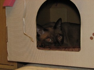 PCに座る私の背中が見える場所に置かれているキャットハウスです。ワタシがPCに向かうと最近はこのキャットハウスから覗きながら居眠りするのがお約束なのです。退屈してくると大あくびをしてすぐ居眠り体勢に入ります。ワタシも寝るのが好きだし、かなり眠ってるほうだと思うけれど。どんなに頑張っても猫さんにはかないませぬ。入り口にブラブラとぶら下がっているのは、ダンボールを梱包するPPバンドです。コレでじゃらすとよく遊んでくれるのです(^-^)声を掛けると視線をワタシに向けて用件を探ります。なにか新鮮な楽しみがあるかと思ったら・・ない。ワタシが移動するかと思ったけど・・しない。まぶたが重くなる~。そしてまた眠りの淵に落ちていく~。マッタリと寝てばかりの王子様ネコさまです。最近記事が・・寝てる王子様ネコばかり(* ̄∇ ̄*)エヘヘ別ブログはコチラからどぞ★ 「ワタシ的快適ネット生活」by ゆきもなか