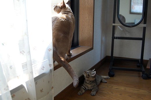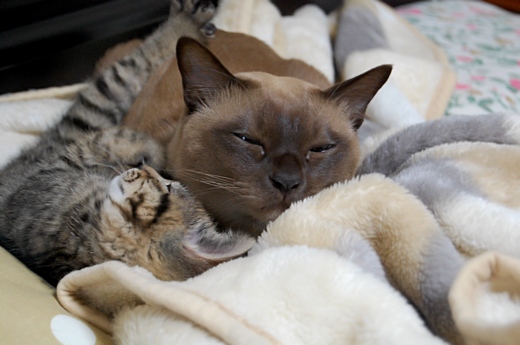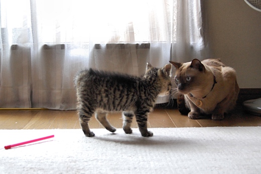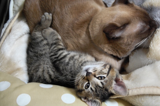 すでに仲良関係の モコ を見習って、子猫に対する許容範囲を広くした。・・・ような気がしますです。