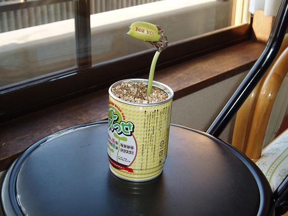 友達からこんな珍しい缶詰をもらって、はじめ分らないので大豆の缶詰と思い何の料理にと考えよくよく説明書よめばなんとメッセージが記されている豆の木。4・5日でこのように芽が出ました。これから二葉がでてつるがのびるんかな~ぁ。ちょと楽しみ