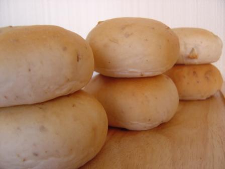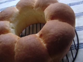 おはようございます。昨日・・・いえいえ、おととい焼いたパンです久しぶりにエンゼル型を使いました。みかさんのリッチ生地で作ろうと思ったのですが、牛乳が50cc位足りずその分生クリームで代用しました。次の日の朝食です。前日の残り物の処分で~す。ポテトサラダと黒豚の煮物(思いっきり和食)それにヨーグルトです。 おととい焼いたパン、本当は昨日アップしたかったのですがバタバタの一日でした。午前中は久しぶりに子育て支援センターに子供を連れて行き、午後からは夫を病院へ連れて行きそのまま入院となりました先週の木曜日の夜、ベビーベッドの柵を倒さず息子の着替えをさせようとしたら、腰をやっちゃいました・・・もともと「腰椎分離症」とは言われていたのですが、今回はかなり重症です。先週の金曜日に病院に行ったのですが、骨には異常はないので安静にするようにと言われ、4~5日ずっと寝ていたんです。しかし症状は一向に改善されず、再度病院へ行き入院となったわけです。腰を悪くすると何も出来ませんよね。歩けず這ってトイレに行っていましたから・・・皆様も腰にはお気をつけくださいませ。