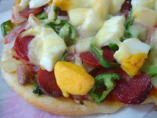 今日のお昼に食べたピザです。200gで2枚作りました。具沢山ピザピザソースを全体に塗り、ゆでたメークインにブロッコリー、玉ねぎ、ピーマン、ウインナー、サラミ、ベーコン、ゆで卵にとろけるチーズをたっぷりのせて。照り焼きチキンピザオリーブオイルを全体に塗り、小ねぎをたっぷり、れんこん、お餅、照り焼きチキン(砂糖、しょうゆ、みりん、砂糖で味付け)をのせて、マヨネーズを格子状に塗りました。 具沢山の方は娘用にと思ったのですが、ウインナー、ベーコン、サラミをほじくって食べてばかりで野菜は食べてくれませんでした照り焼きチキンの方は思った以上に美味しかったです。照り焼きチキンにマヨネーズがぴったりで、おまけにれんこんのしゃきしゃき感とお餅のもちもち感があいまってなんとも言えず美味しい~~お餅はまだ沢山残っているのでまた作ってみよう