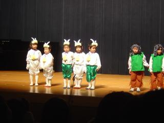 今日は幼稚園の発表会がありました。娘の幼稚園では近くの文化会館で発表会が行われます。小ホールとはいえ150人くらい入る立派なところです昨日は予行練習があり、一足早く園児のお遊戯や劇を見てきました。年長さんの女の子は着物を着てお遊戯をするのが恒例で髪も結い着物も着て『ハナミズキ』や『夜桜お七』を踊っていました。そこで・・・わが子が踊っているわけでもなく、特に仲良しの知り合いの子がいるわけでもないのに、ものすごく感動してしまって涙ぐんでしまいました。本番の今日もやっぱり感動してしまって涙を流す私。そして未満児さんのゲキレンジャーのお遊戯にも感動して涙する私こんなに小さいのに一生懸命踊って・・・でもわが子のお遊戯とかは特に感動はしないんですよね。ちゃんと踊れてるの?なんて思ってしまうので素直に冷静に見られないのかな?娘は劇が『3匹のやぎのガラガラドン』の中ヤギ役、合唱と合奏『アイアイ他』そしてお遊戯の『プリキュア5』は出る前に舞台袖で撮りました。娘はキュアドリーム。みんなそれぞれレモネードやミントになりきってますよ~。決まってる~~9月の運動会以来の大きな行事でしたが、あれから2ヶ月しかたっていないのに子供たちはものすごく成長しましたね。入園した時はまだまだお子ちゃまだったのに、こんなにしっかり踊れて劇では台詞もちゃんと言えるだ~~。ジーン・・・なんて。でも一番大変だったのは担任の先生ですよね。衣装作り、お遊戯4曲の振り付け、劇の台詞や踊りなど全て先生がやったんですもんねお疲れ様でしたY先生。そして娘にも、良く頑張ったね