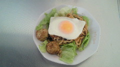 6日の昼食です。昼食は90%以上うどんかもっていうくらい、昼はうどん食べています(^_^;)今回は、ひき肉とねぎ入りやきうどんです。レタスを下に敷き詰めて、うどんの上に目玉焼きをのせてます。そして冷凍庫にあった余り物のたこやきも添えました。レタスにはちょっとごま油を振りかけて塩もちょっぴりかけてます。いかにもこってりチープな感じ・・・だけどこういうのが好きです(^v^)