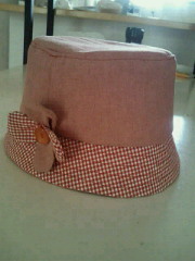 この間、娘用のパーカーを作った残りの生地と、うちにある生地を組み合わせて帽子を作りました。丸いものを縫うって難しいですね(ミシンですが)。最初は表側を全て無地の生地、裏をチェックで統一しようと思ったのですが、ちょっとシンプルすぎるかな~と思って、プリム部分をチェックにしました。あとは、残り生地でコサージュを作って帽子につけました。今朝、帽子をかぶせて写真撮影しました(笑)