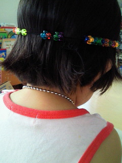 今回は、ビーズのネックレスを頭につけて、オモチャのネックレスを首につけてました。