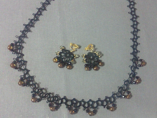 『タティングレースの首飾り』という本に載っていたイヤリングを、ビーズなどを変えて作ってみました。初めてビーズを編み入れる事にチャレンジしました。ビーズを入れたピコットの形がきれいに整わなくて、難しいなぁと感じました。でも、ビーズの組み合わせを考えるのは楽しいですね。手持ちのビーズの種類、数ともに少ないですが、このイヤリングは少ないビーズでできるのが嬉しいところ。可愛いのも好きなのですが、自分の服装とか考えて、普段アクセサリーをしない私でも気軽につけられるように、色合いはシックにしました。チェコビーズのFPラウンドのブラックダイヤモンド、FPラウンドのガーネット、トライアングル・ブロンズのミディアムトパーズ、あとは、以前はあと&はあとのキットに入っていて、余ったゴールドの粒ビーズを使いました。なるべく色味を抑えてます。ガーネットは本当に濃くて、光に透かさないと黒く見えます(^_^;)でも、光に翳すとすごくきれいな赤に見えるんですよ(^^)スワロフスキーのキラキラした輝きもいいですが、チェコビーズの柔らかい透明さもいいですね~。とりあえず、今日は片方だけ作りました。イヤリングのパーツはあるのですが、ボールチップが無いので用意しないとなぁ(^_^;)【送料無料】タティングレースの首飾り今回の材料を購入したお店↓サリーズ ビーズ ショップスワロフスキー、チェコビーズ、ヴェネツィアンビーズ、天然石ビーズ、形も色も様々で、あれもこれも欲しくなって迷っちゃいます(^_^;)ちょっとずつ色々なビーズを揃えていきたいと思います♪